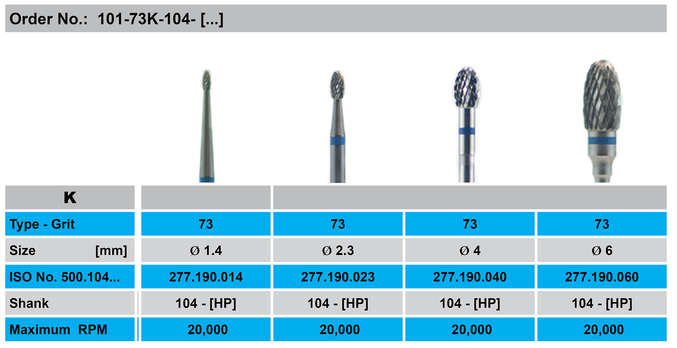 Football K, cross cut, (blue ring). Suitable for efficient reduction of non-precious metal, precious metal, model metal, denture acrylics and dry plaster