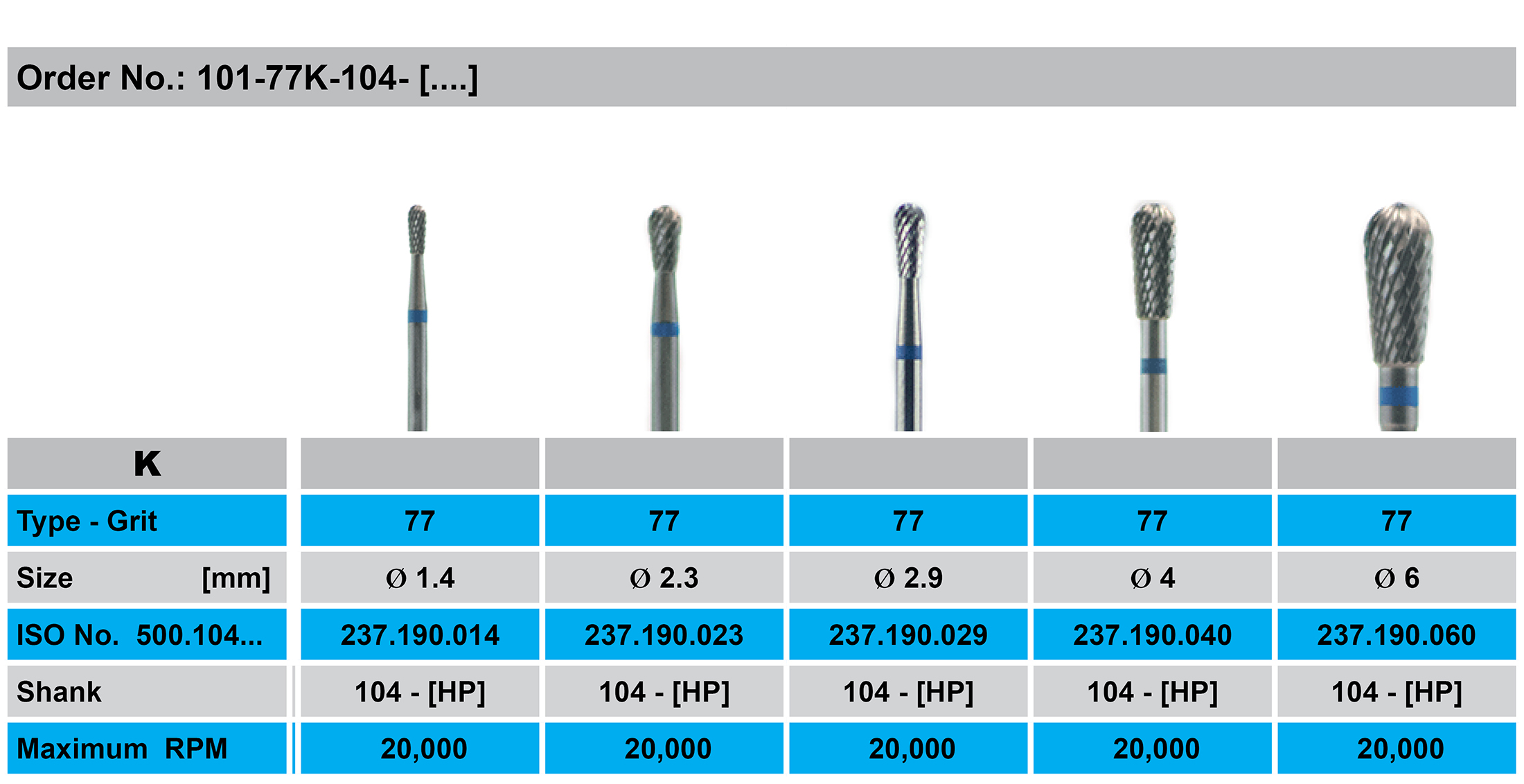 Pear K, cross cut, (blue ring). Suitable for efficient reduction of non-precious metal, precious metal, model metal, denture acrylics and dry plaster