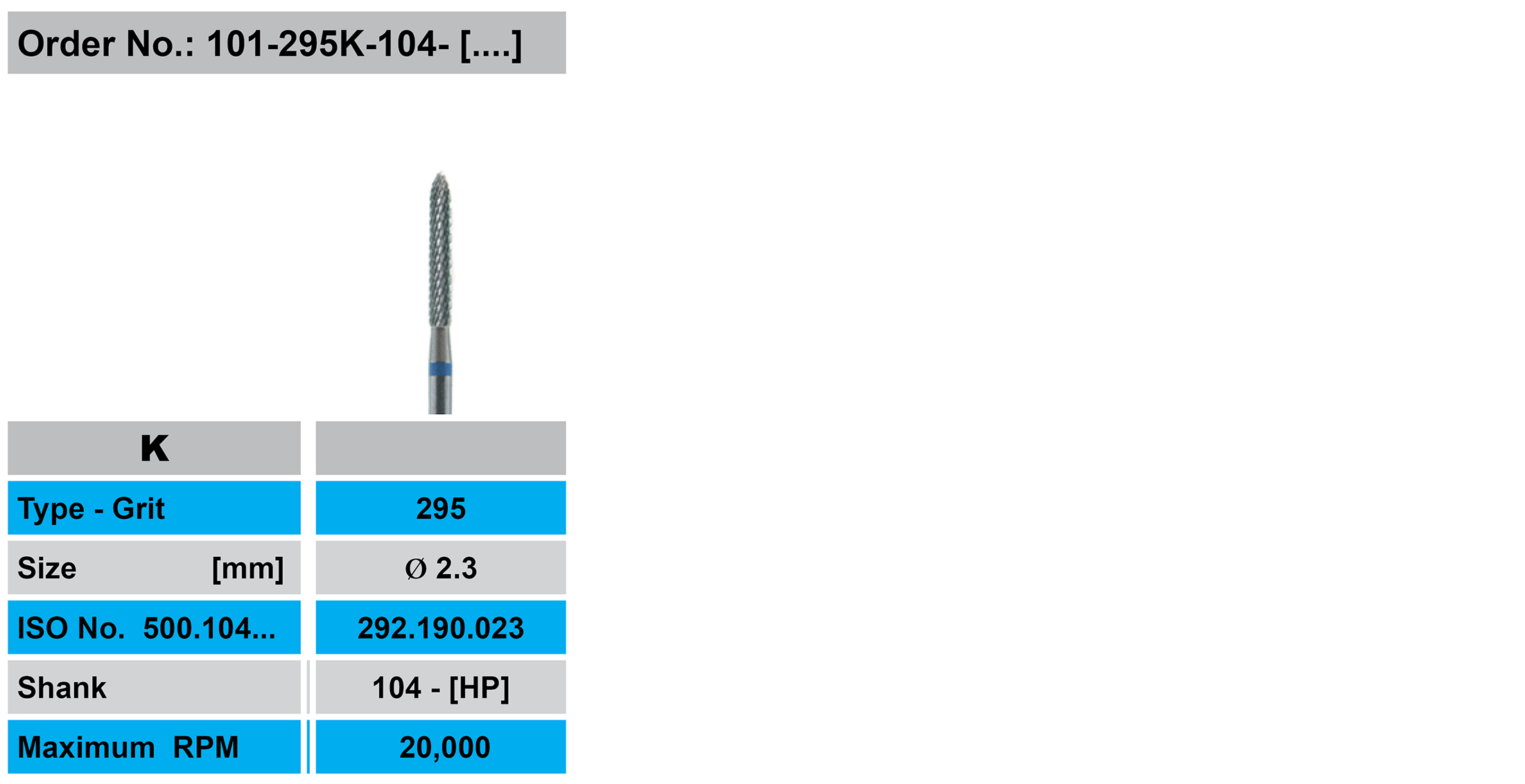 Torpedo K, cross cut, (blue ring). Suitable for efficient reduction of non-precious metal, precious metal, model metal, denture acrylics and dry plaster