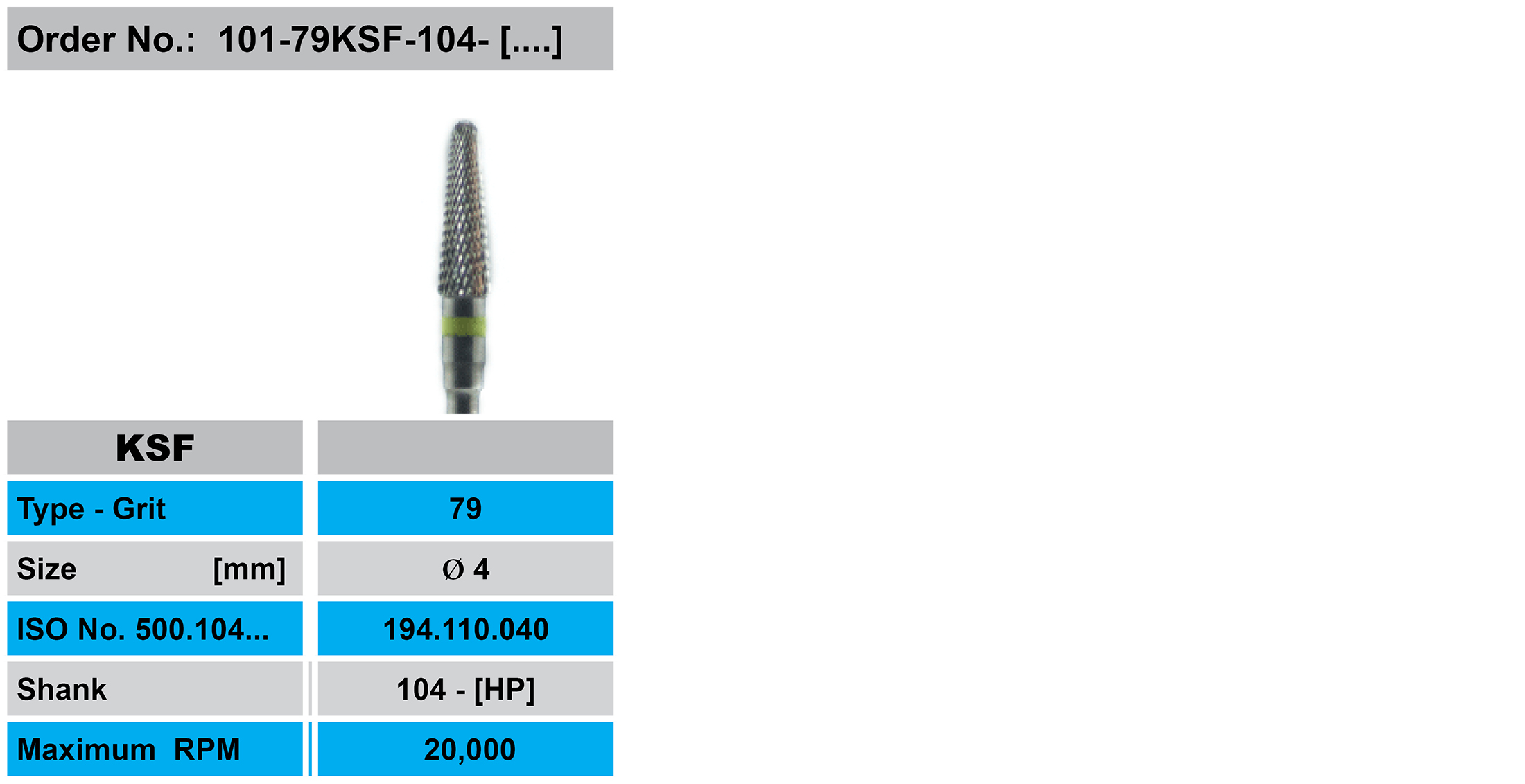 Round end cone KSF, extra fine cross cut, (yellow ring). suitable for the efficient reduction of precious metal, non-precious metal, model metal, and veneer acrylic.