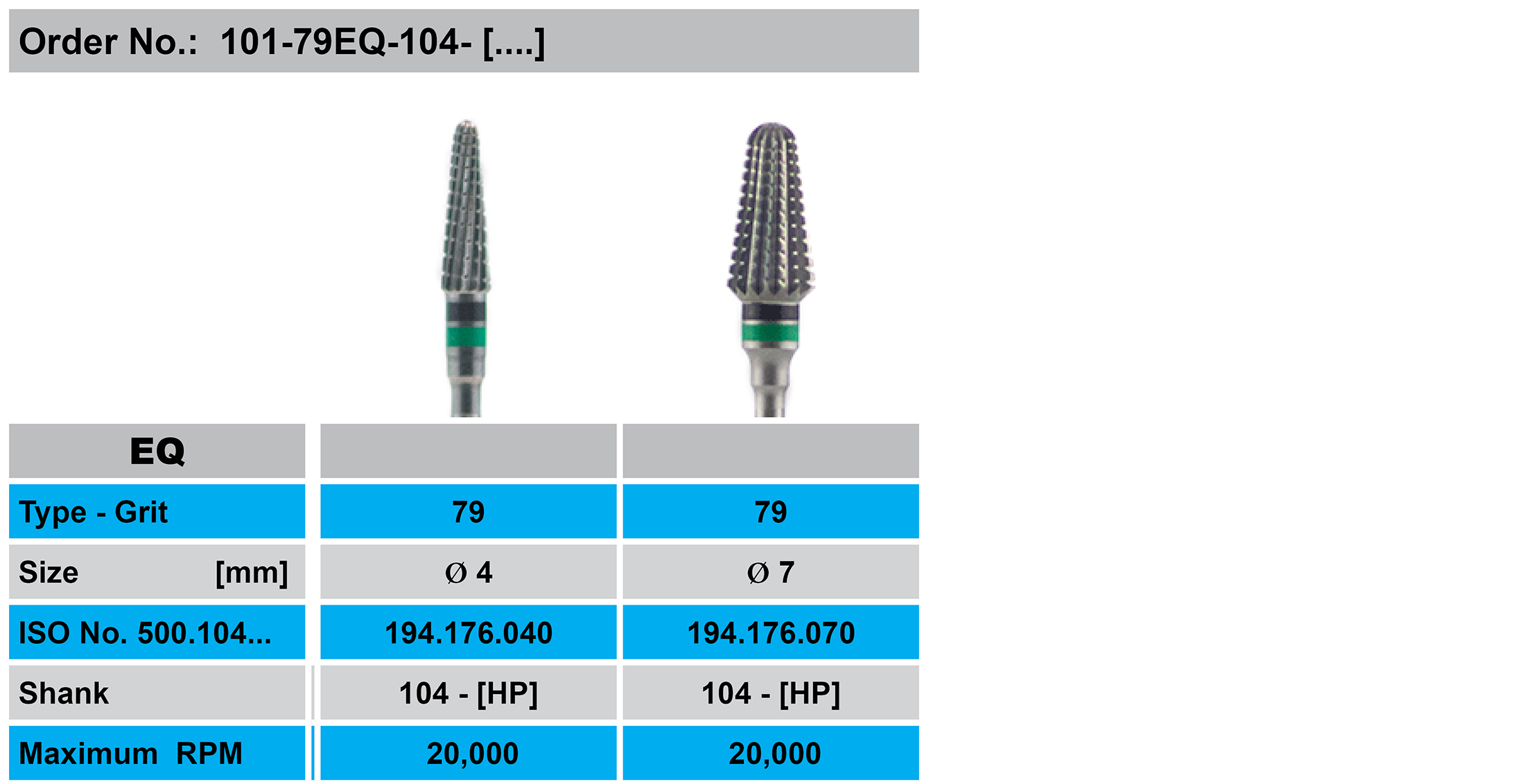 Round end cone EQ plain toothing with transverse cross cut, (black & green ring). Denture and soft acrylics.