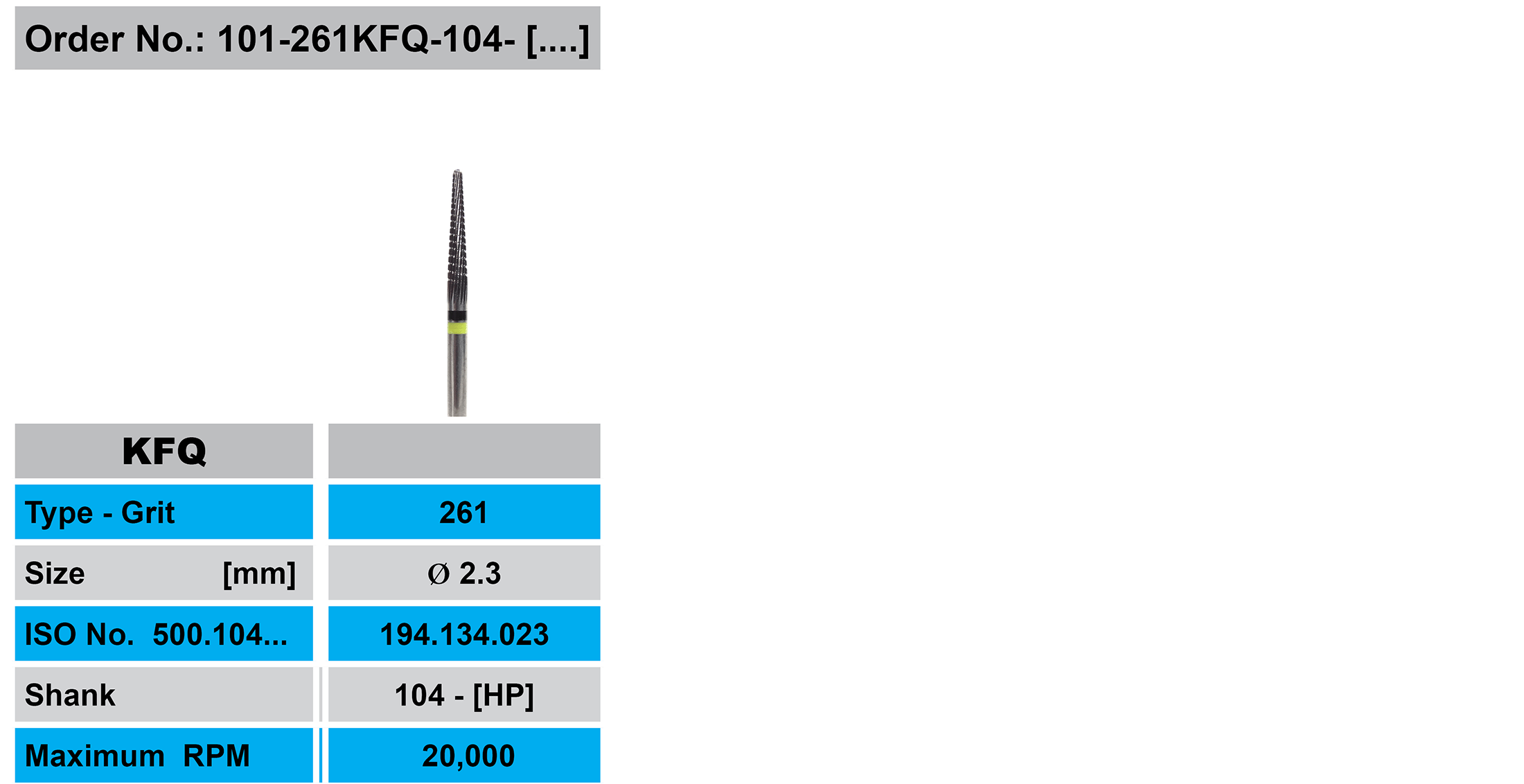 Tapered cylinder KFQ fine plain toothing with transverse cross cut, (black & green ring). Denture and soft acrylics.