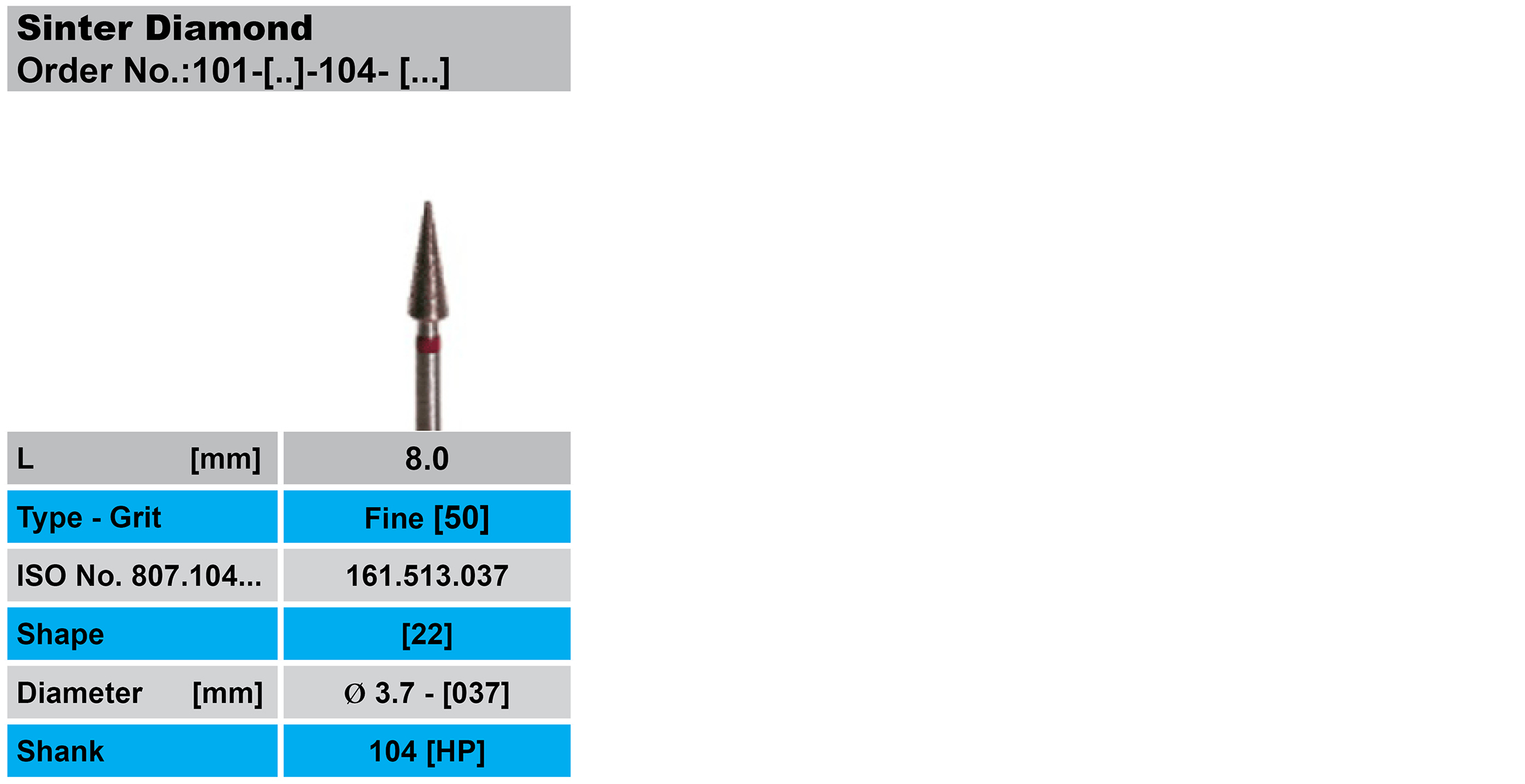 While galvanic diamond burs consist of only a few layers diamond, Sintered Diamond burs consist of concentrated and homogenous grains of sintered diamond evenly suspended and bonded in a metal compound right down to the burs shank. Sintered Diamond burs are characterised by their extremely long life and dimensional stability, as well as their excellent abrasive qualities. They are available in four grit sizes Extra coarse, coarse, medium and fine. Uses: Sintered diamonds can be used on: Model castings, Crown and bridge and in veneer and ceramic blending applications.