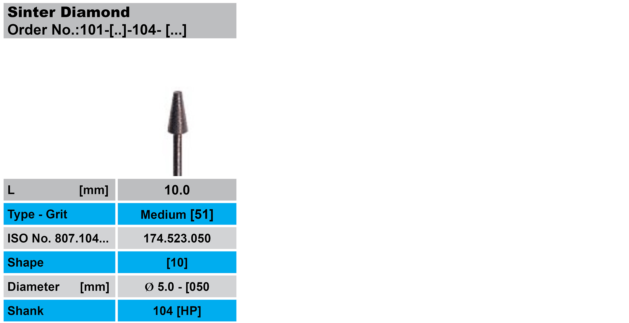 While galvanic diamond burs consist of only a few layers diamond, Sintered Diamond burs consist of concentrated and homogenous grains of sintered diamond evenly suspended and bonded in a metal compound right down to the burs shank. Sintered Diamond burs are characterised by their extremely long life and dimensional stability, as well as their excellent abrasive qualities. They are available in four grit sizes Extra coarse, coarse, medium and fine. Uses: Sintered diamonds can be used on: Model castings, Crown and bridge and in veneer and ceramic blending applications.