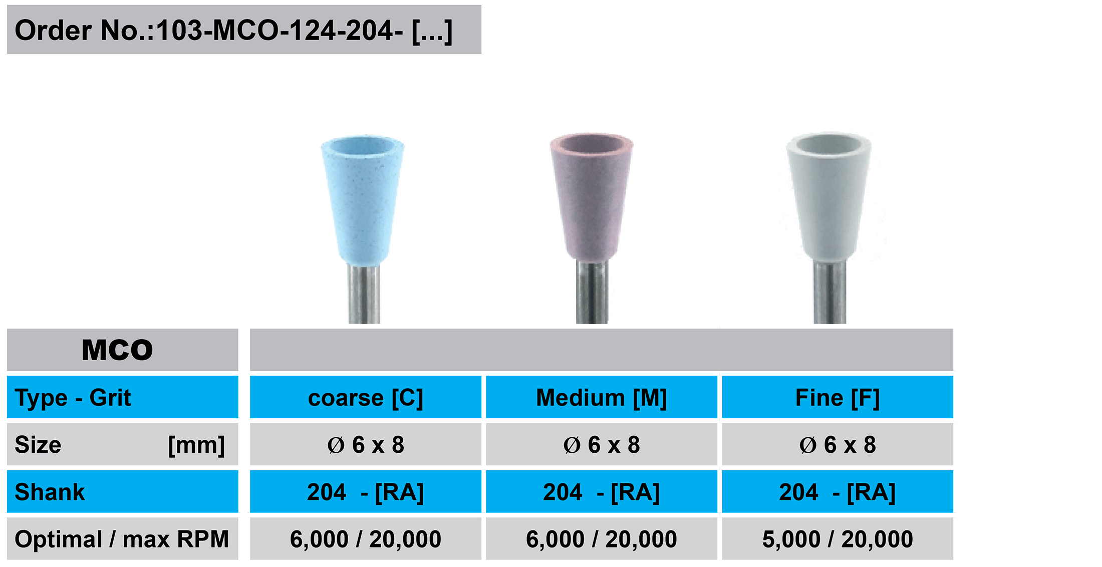 The MCO range is a comfortably soft 3 step diamond impregnated polishing system. It is designed for the removal, smoothing and high gloss polishing, of the most common composites.