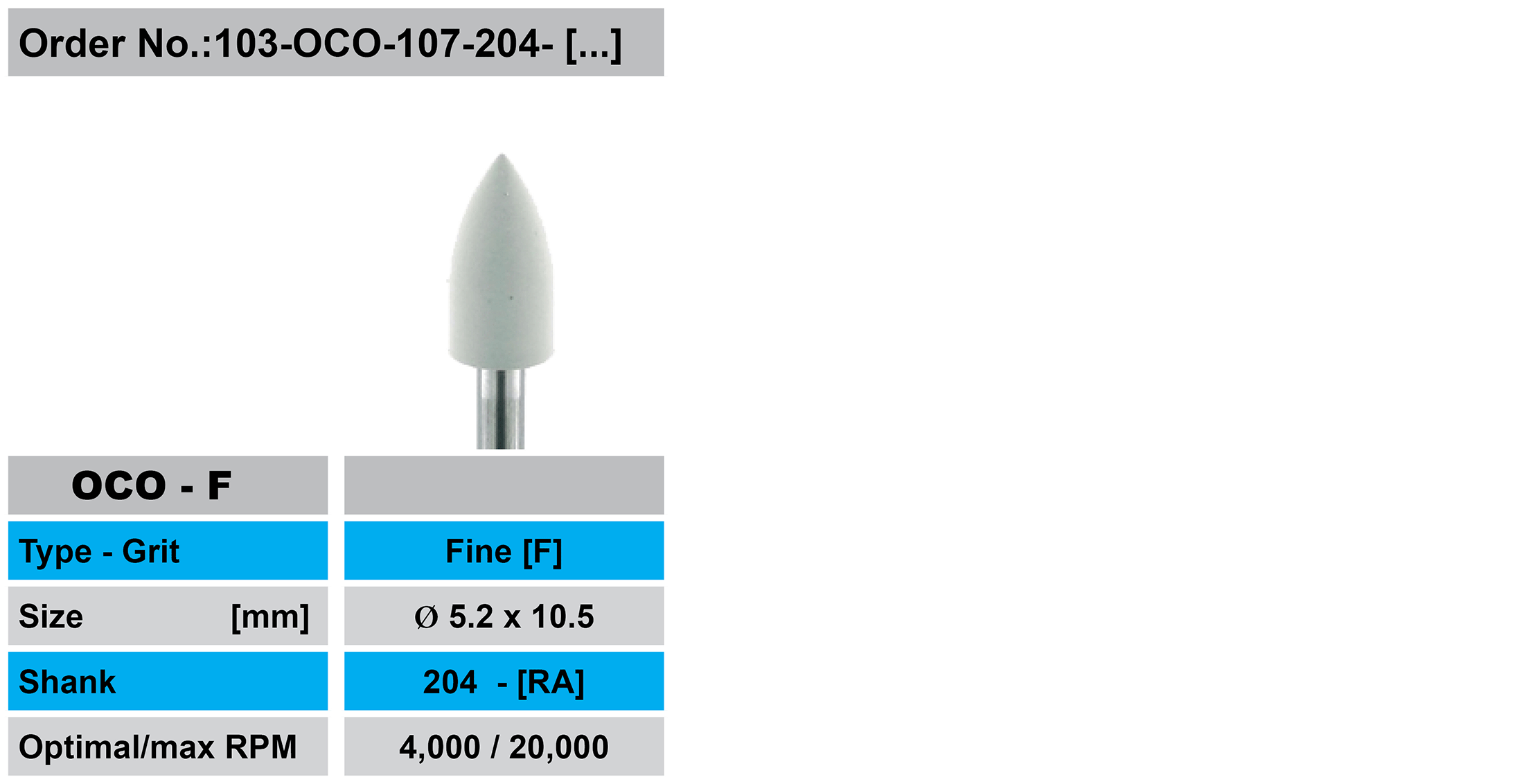 The OCO range is a 1 step diamond impregnated polishing system. It has multiple grit and was designed for 1 step finishing and polishing.