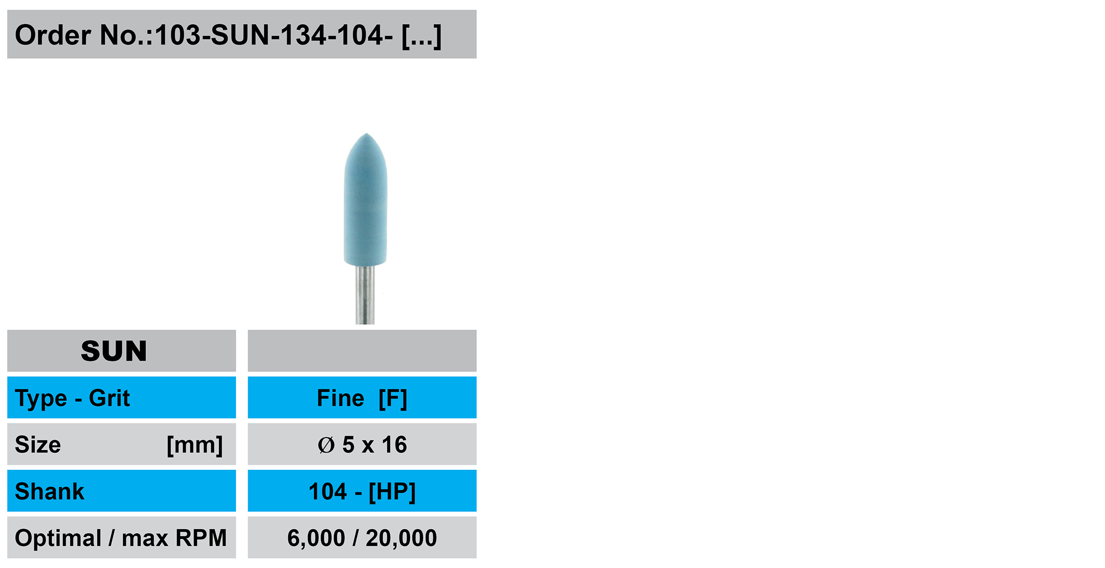 The SUN polishing system is impregnated with a high concentration of fine diamond grit, allowing the user to achieve a mirror finish on all kinds of dental materials. It is designed to be used in conjunction with the BUN and AUN polishers.