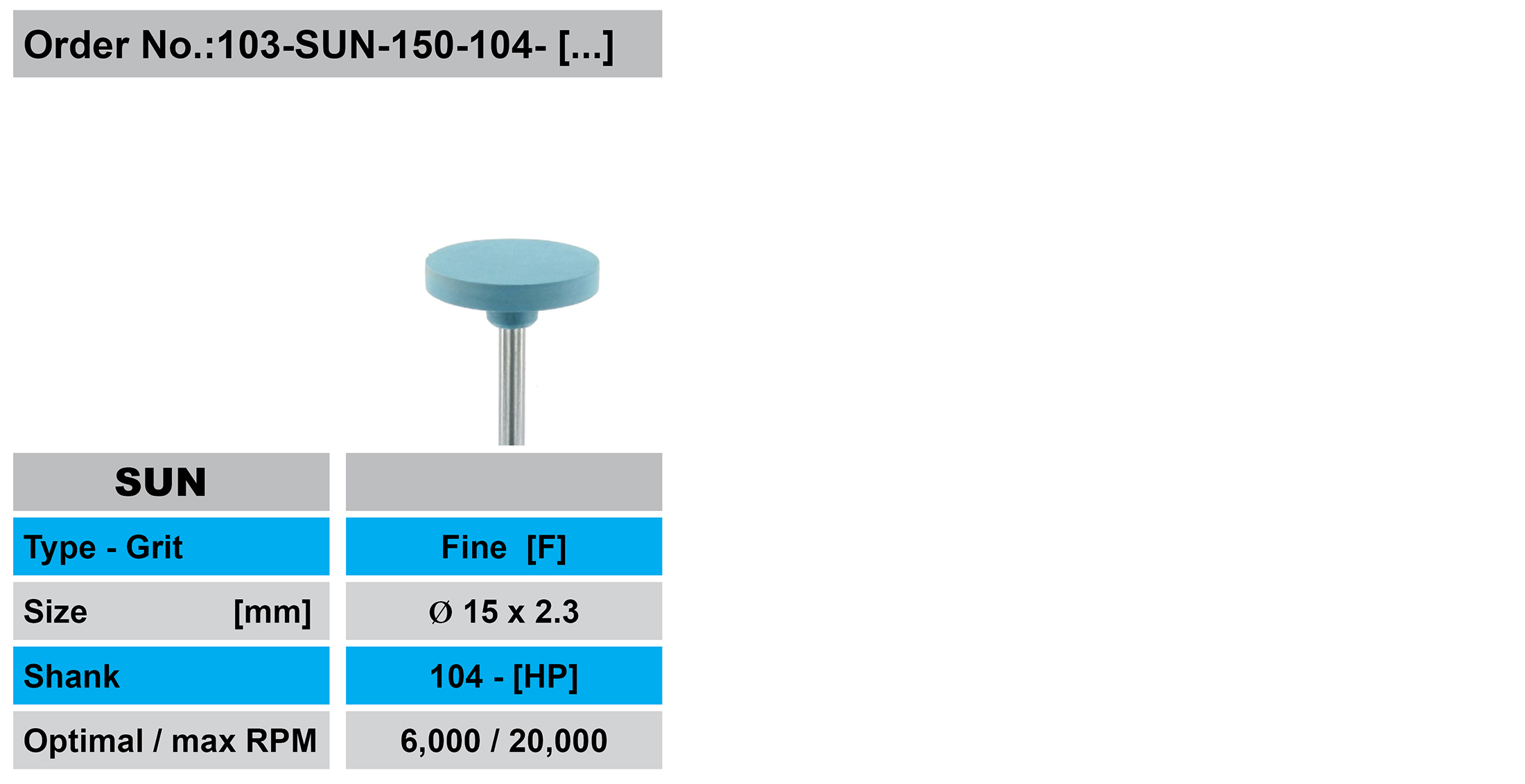 The SUN polishing system is impregnated with a high concentration of fine diamond grit, allowing the user to achieve a mirror finish on all kinds of dental materials. It is designed to be used in conjunction with the BUN and AUN polishers.