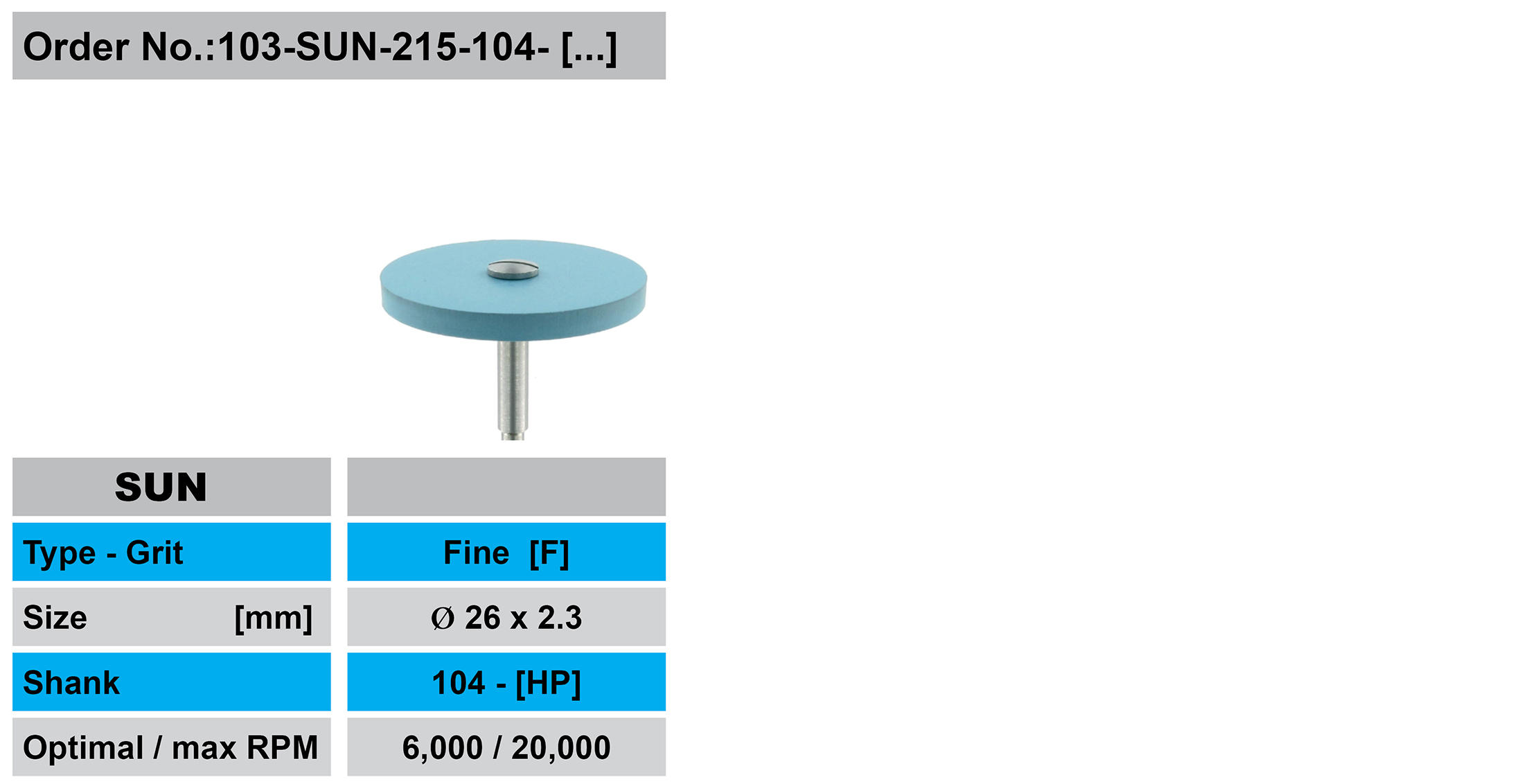 The SUN polishing system is impregnated with a high concentration of fine diamond grit, allowing the user to achieve a mirror finish on all kinds of dental materials. It is designed to be used in conjunction with the BUN and AUN polishers.