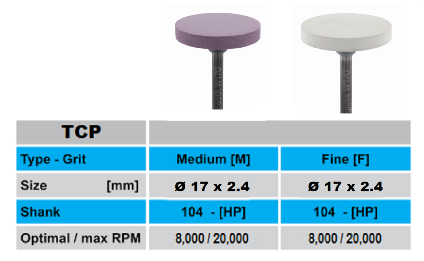 The new 2 step TCP range is a versatile diamond impregnated polishing system designed for polishing Zirconia and other ceramics. The smooth and natural lustre that is achieved is not only aesthetically pleasing, but also insures the long-term stability of the ceramic restoration.