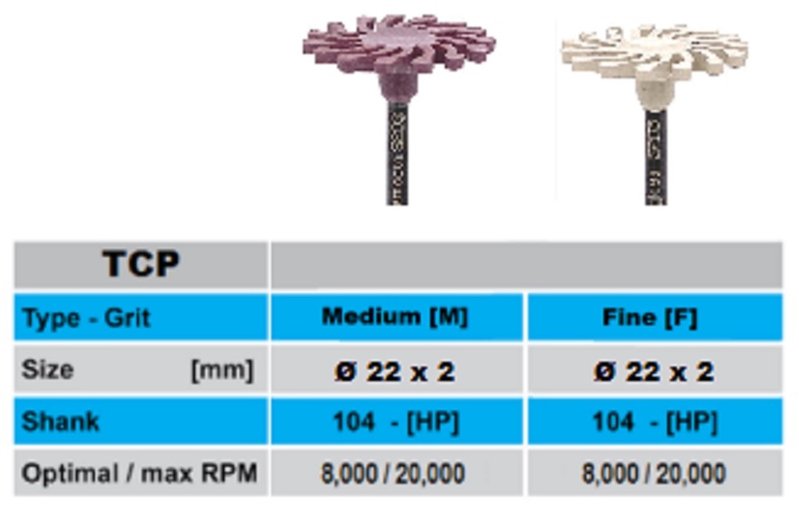 The new 2 step TCP range is a versatile diamond impregnated polishing system designed for polishing Zirconia and other ceramics. The smooth and natural lustre that is achieved is not only aesthetically pleasing, but also insures the long-term stability of the ceramic restoration.