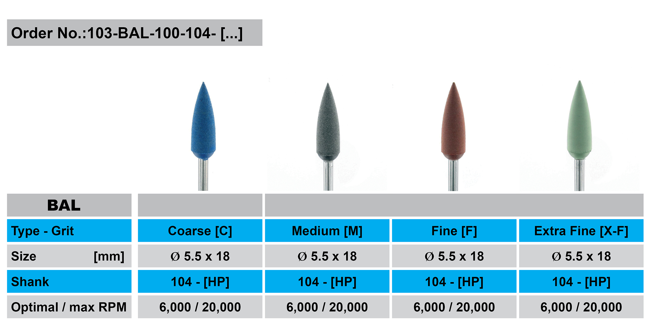 The BAL range is a tried and tested polishing system for cobalt-chrome, precious and non precious metals. The extra fine gives a high luster finish.