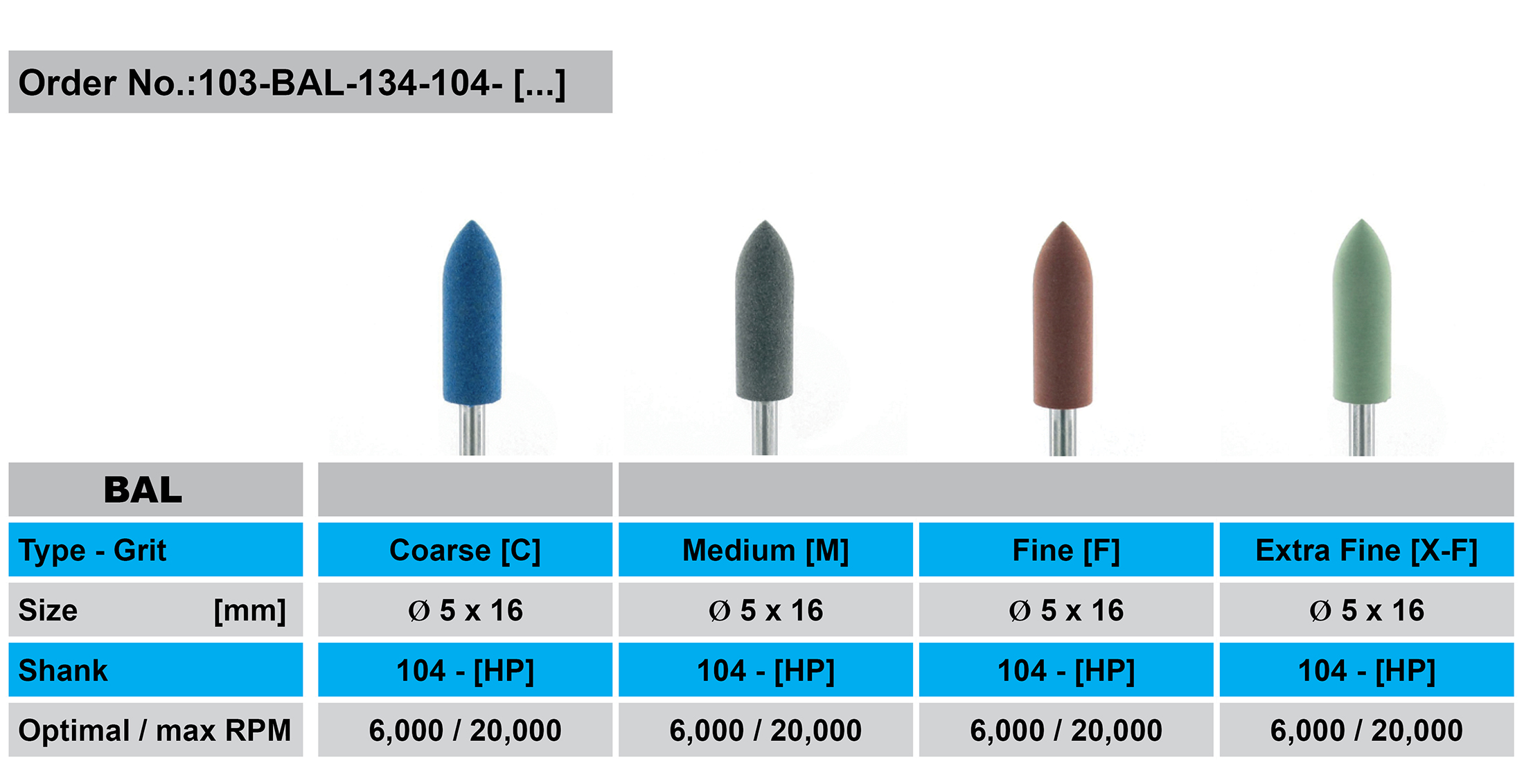 The BAL range is a tried and tested polishing system for cobalt-chrome, precious and non precious metals. The extra fine gives a high luster finish.